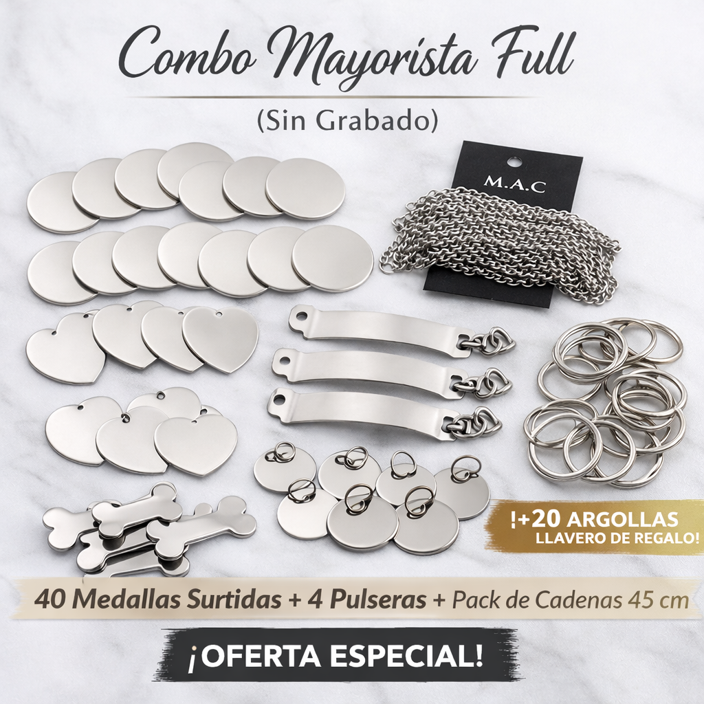 Incluye:• 10 medallas 2 cm• 10 medallas 2,5 cm• 10 medallas llavero• 10 medallas corazón• 10 medallas hueso• 4 pulseras identidad grande• 1 pack de cadenas clásica🎁 20 argollas llavero de regalo
